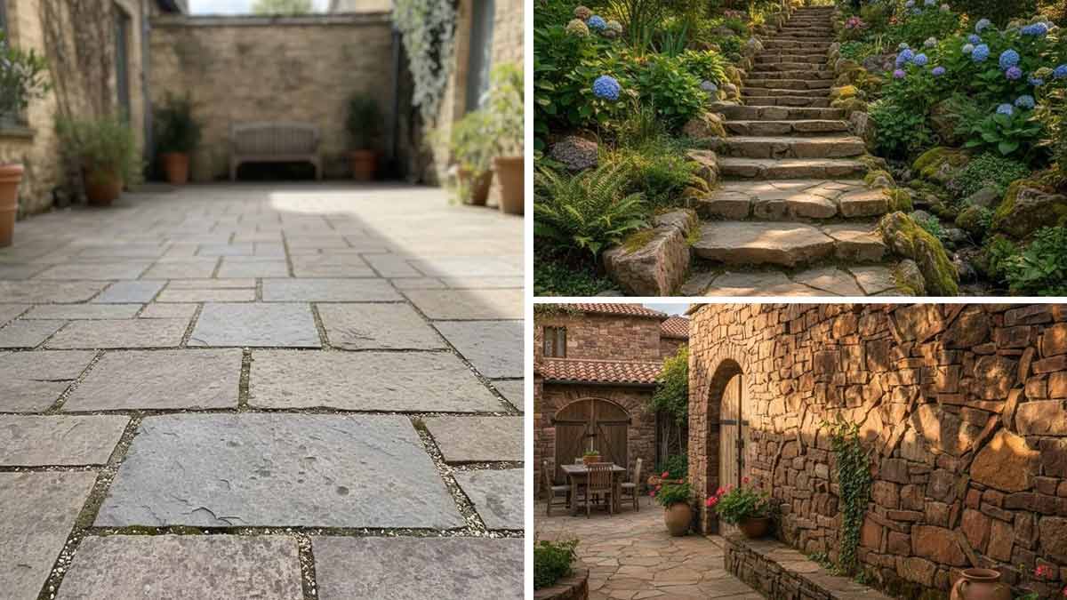 - کفسازی حیاط، باغ و مسیرهای عبوری: سنگ مالون ورقهای