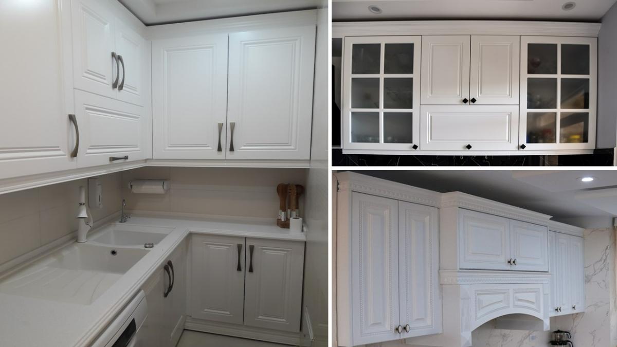 کابینت نئوکلاسیک پلی اورتان تصویر بالا نمونه کار کابینتساز سلام ساختمان است که با ایجاد خطوط ظریف روی تاج، طراحی نئوکلاسیک کابینتها را کامل کرده است.