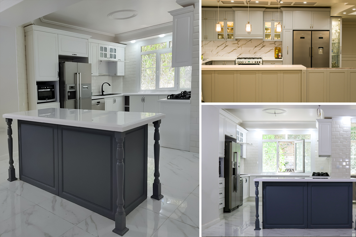 کابینت روکش چوب با رنگ پلی اورتان سفید در کنار جزیره آبی مات، ترکیبی زییا و متفاوت ایجاد میکند. رنگ سفید براق یا نیمهبراق کابینتها، فضا را روشن و بازتر نشان میدهد، در حالی که جزیره آبی مات ، نقطه کانونی است که با ترکیب رنگ کابینتها باعث ایجاد آرامش در فضا میشوند. آشپزخانه میسازد. نصب جزیره در آشپزخانه نیز باعث افزایش فضای کار و ذخیرهسازی شما میشود.